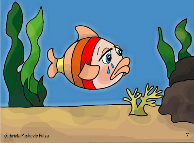 E começou a chorar, ele chorava tão alto que os outros peixinhos ficaram com muita pena dele. Apesar do que Pipoca tinha feito, eles mesmo assim o amavam e resolveram ver o que estava acontecendo.
